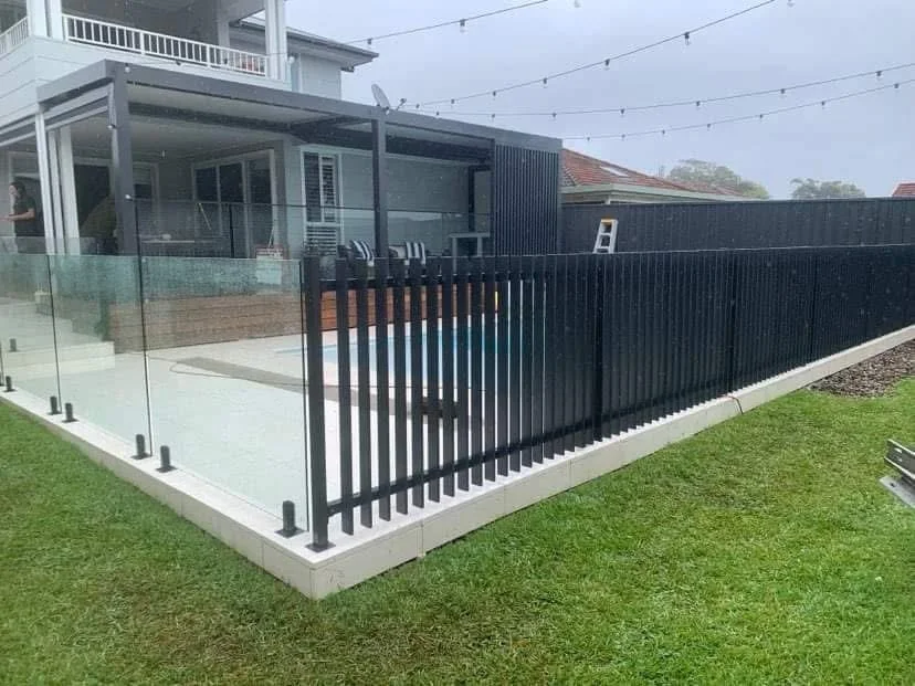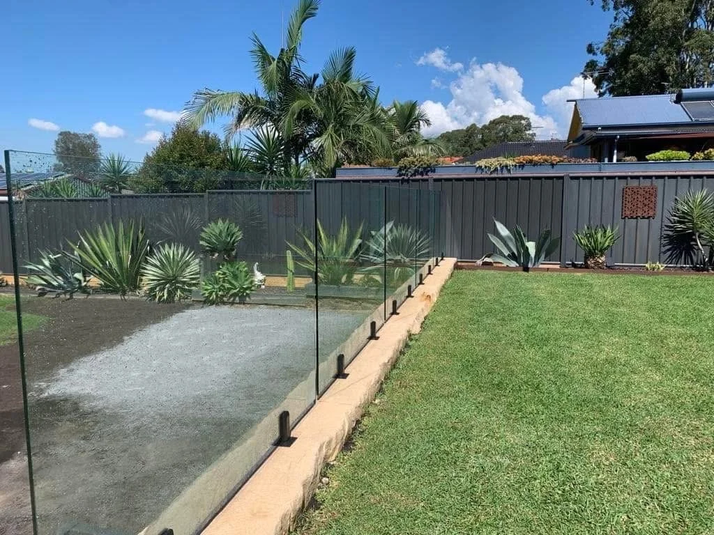 Residential backyard with a swimming pool enclosed by a glass and black metal fence.