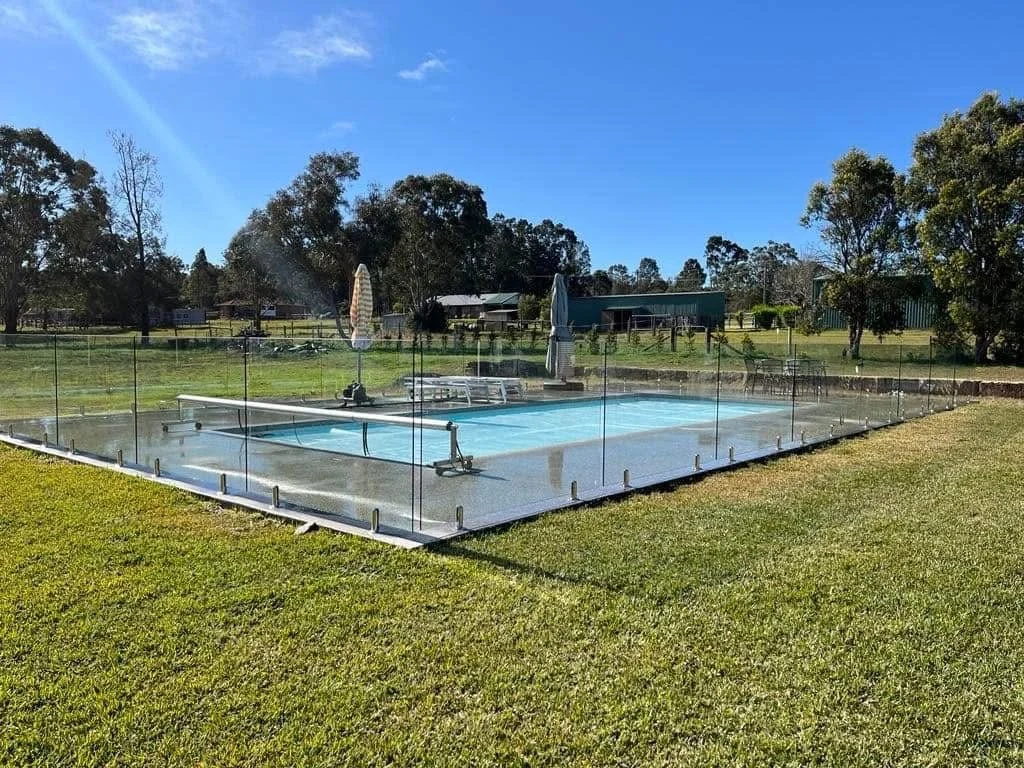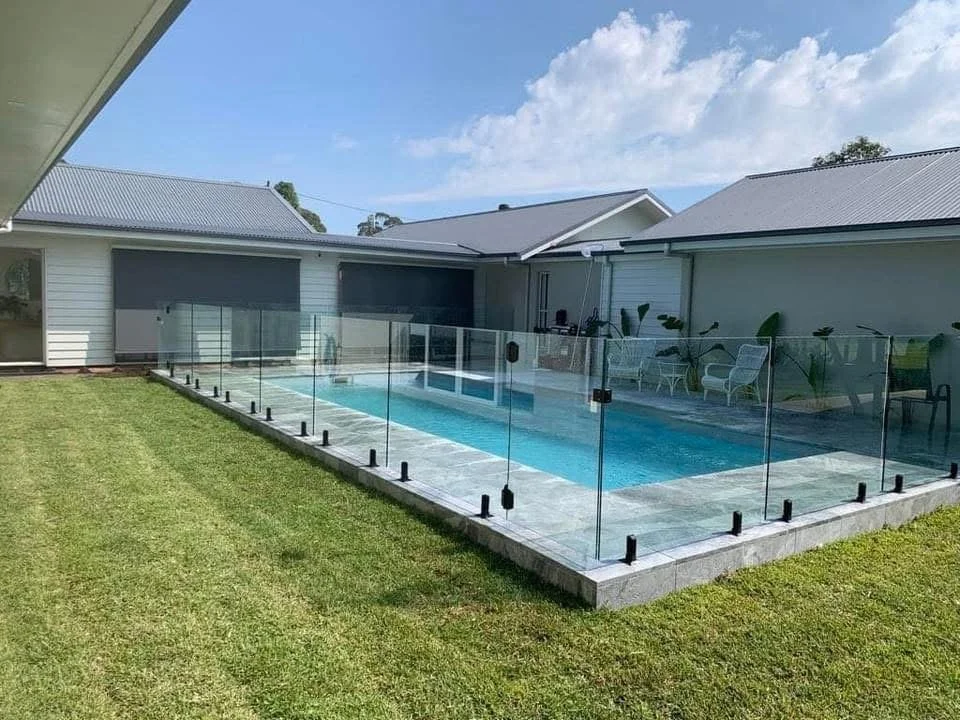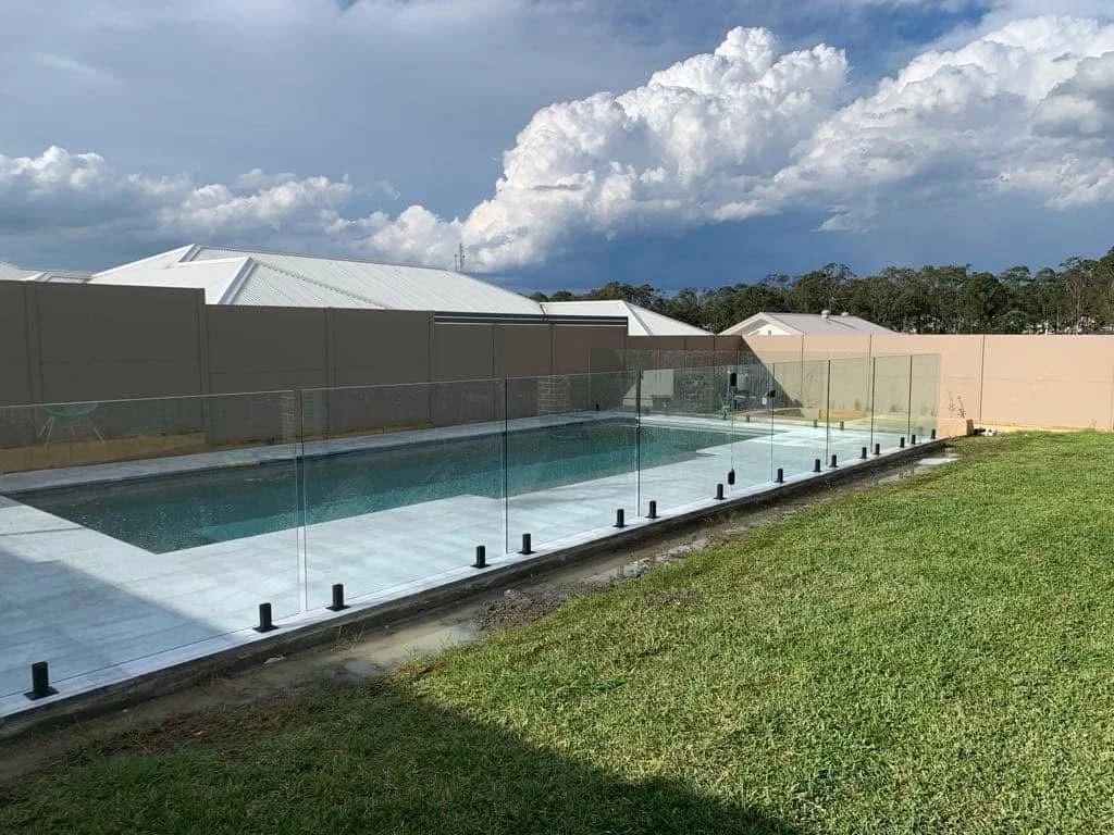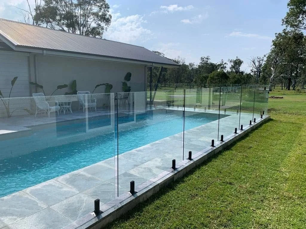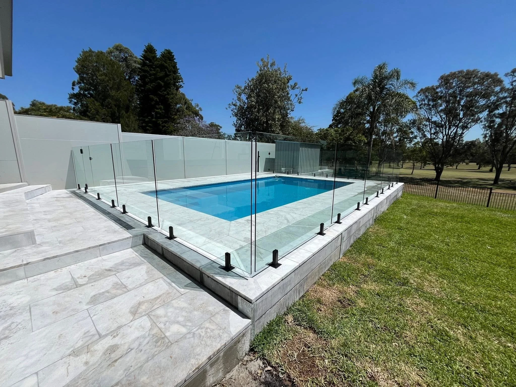 Private backyard swimming pool enclosed by clear glass fencing, surrounded by grass and trees under a blue sky.