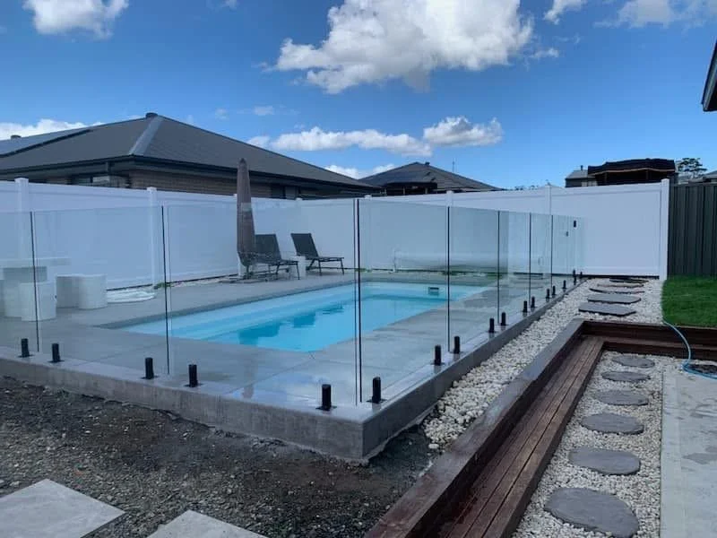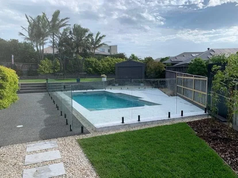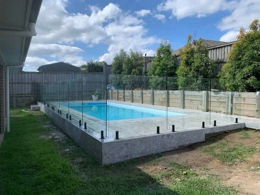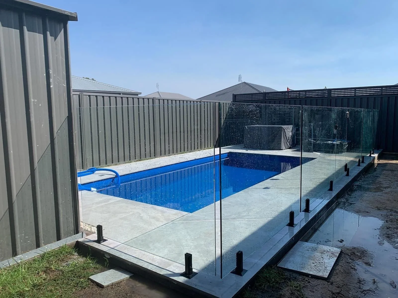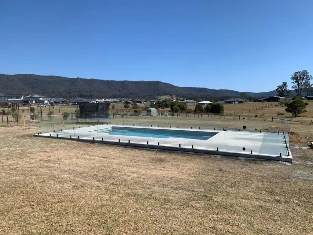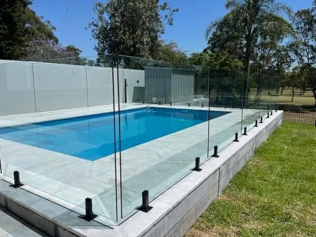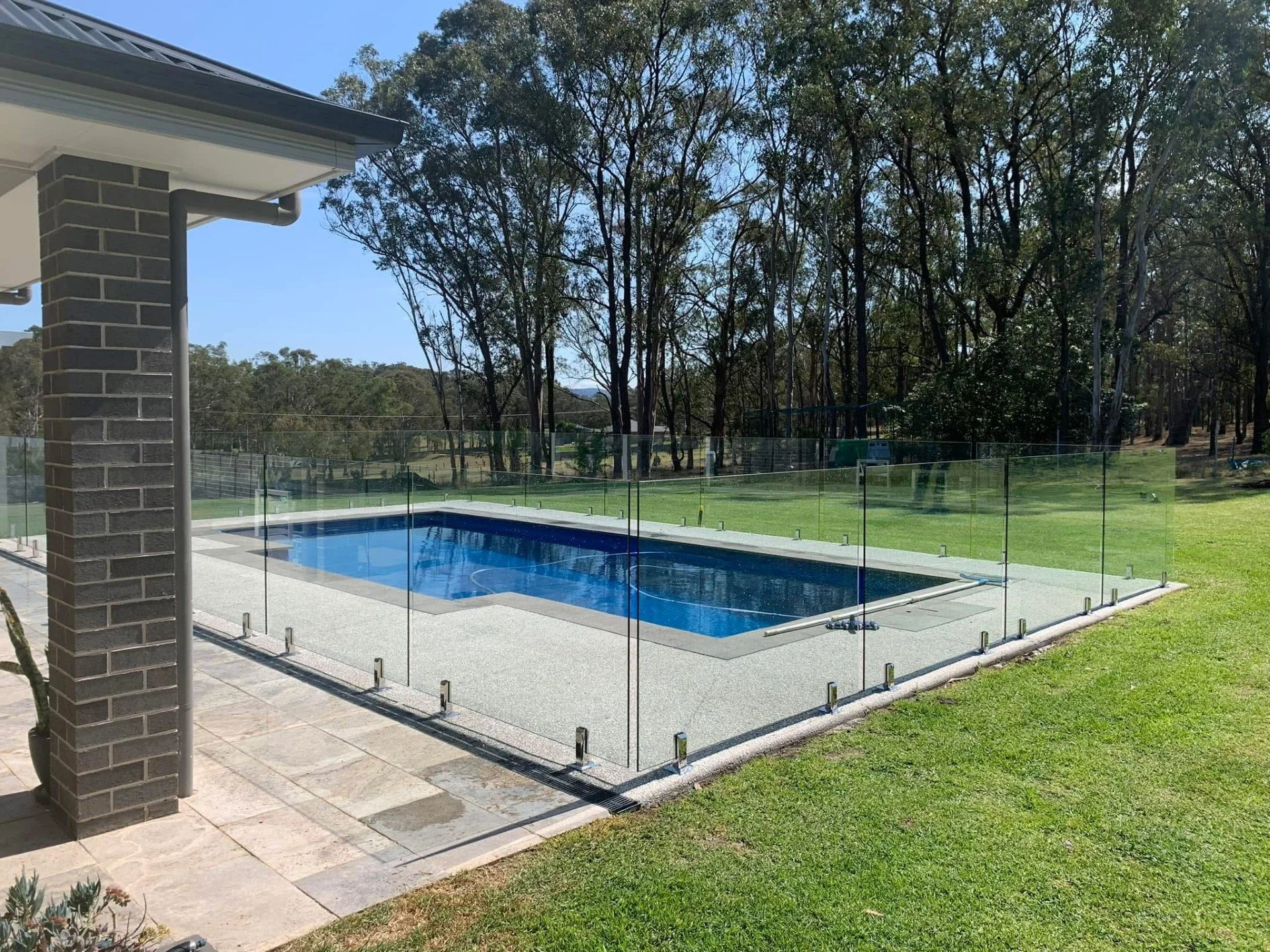 Private backyard swimming pool enclosed by clear glass fencing, surrounded by grass and trees under a blue sky.