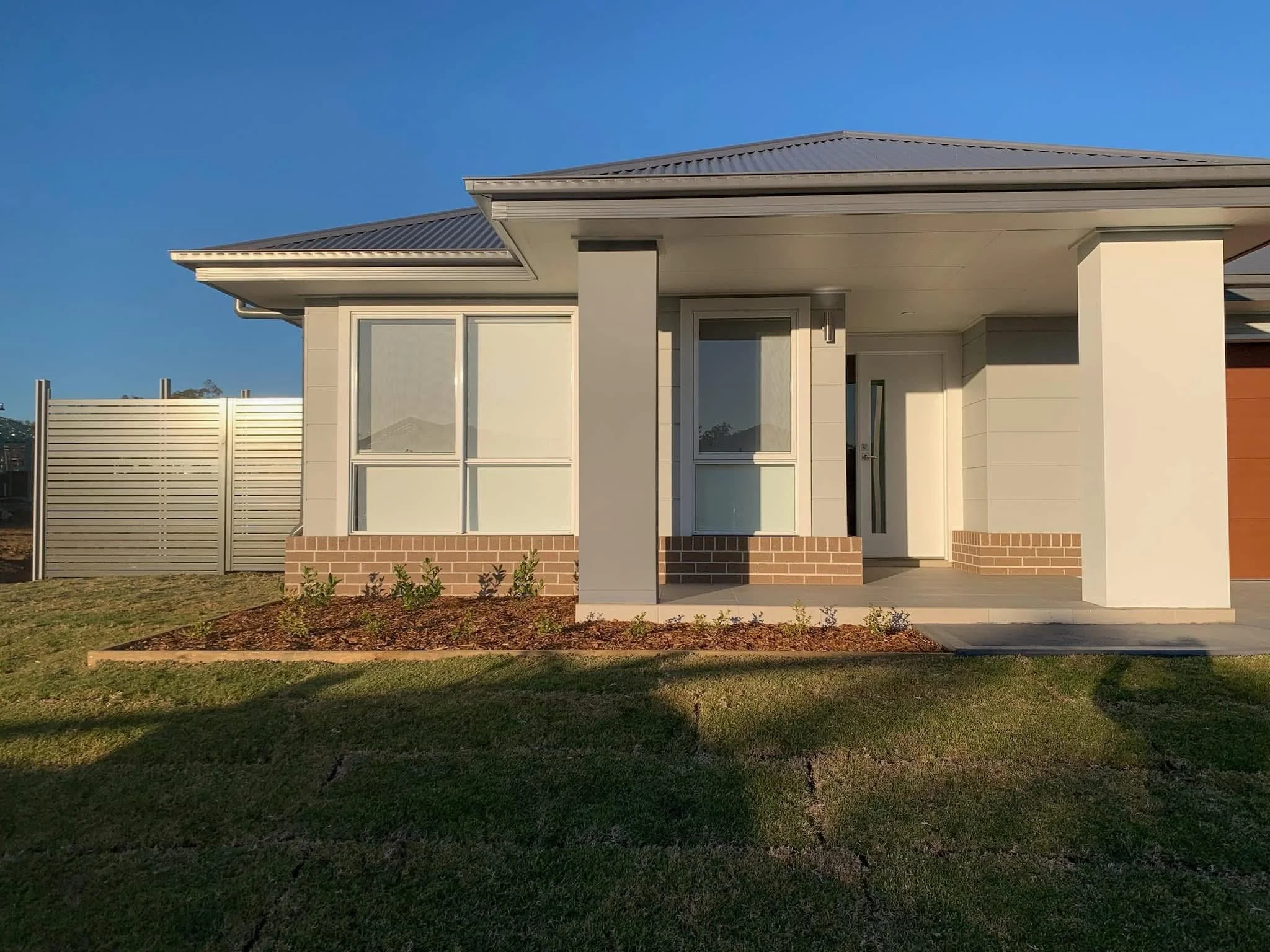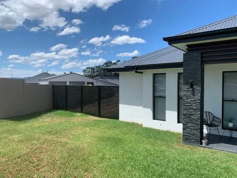 A backyard with a grassy area, a modern house with white and dark stone exterior, black metal fence, and a blue sky with scattered clouds.