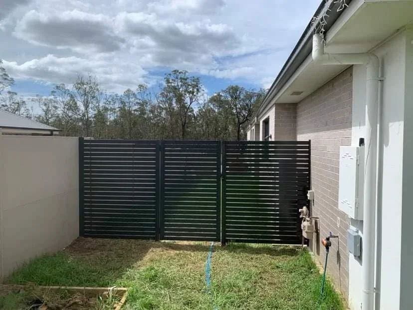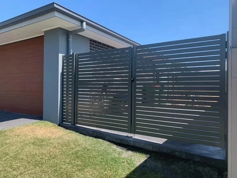 A modern house with a wooden garage door, blue exterior walls, and a black horizontal slat gate leading to a backyard, with grass in the foreground under a clear blue sky.
