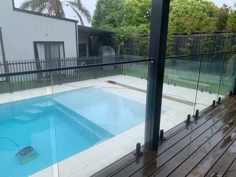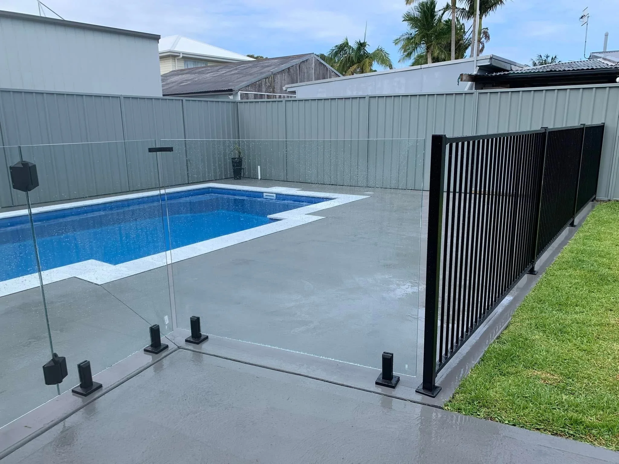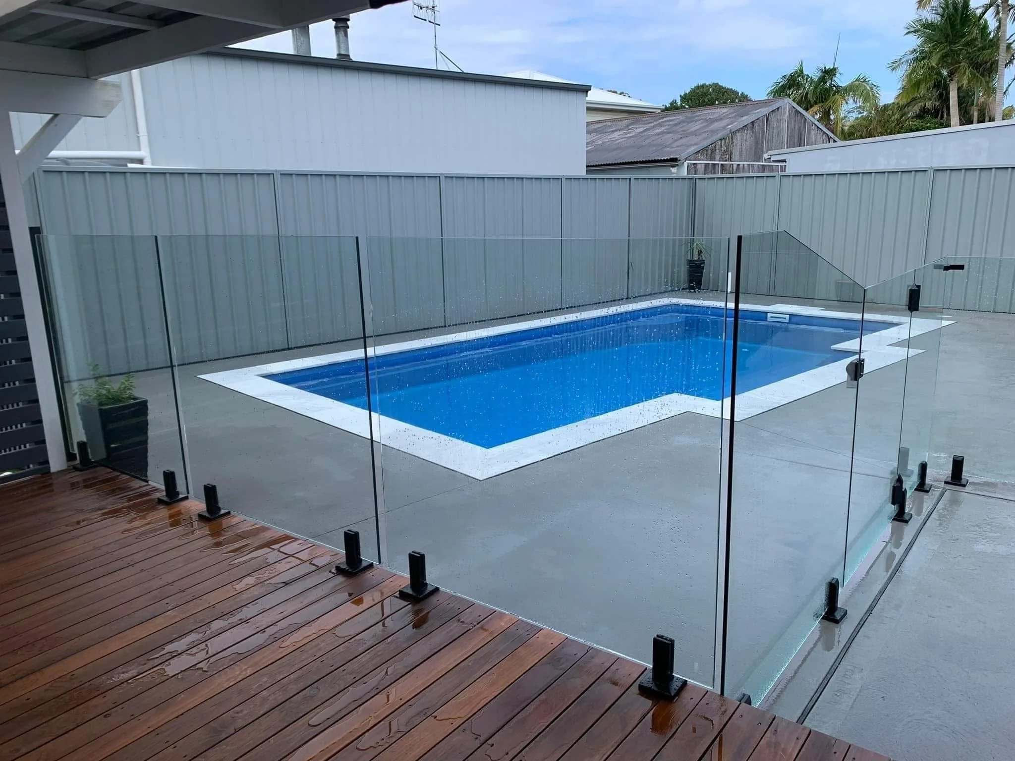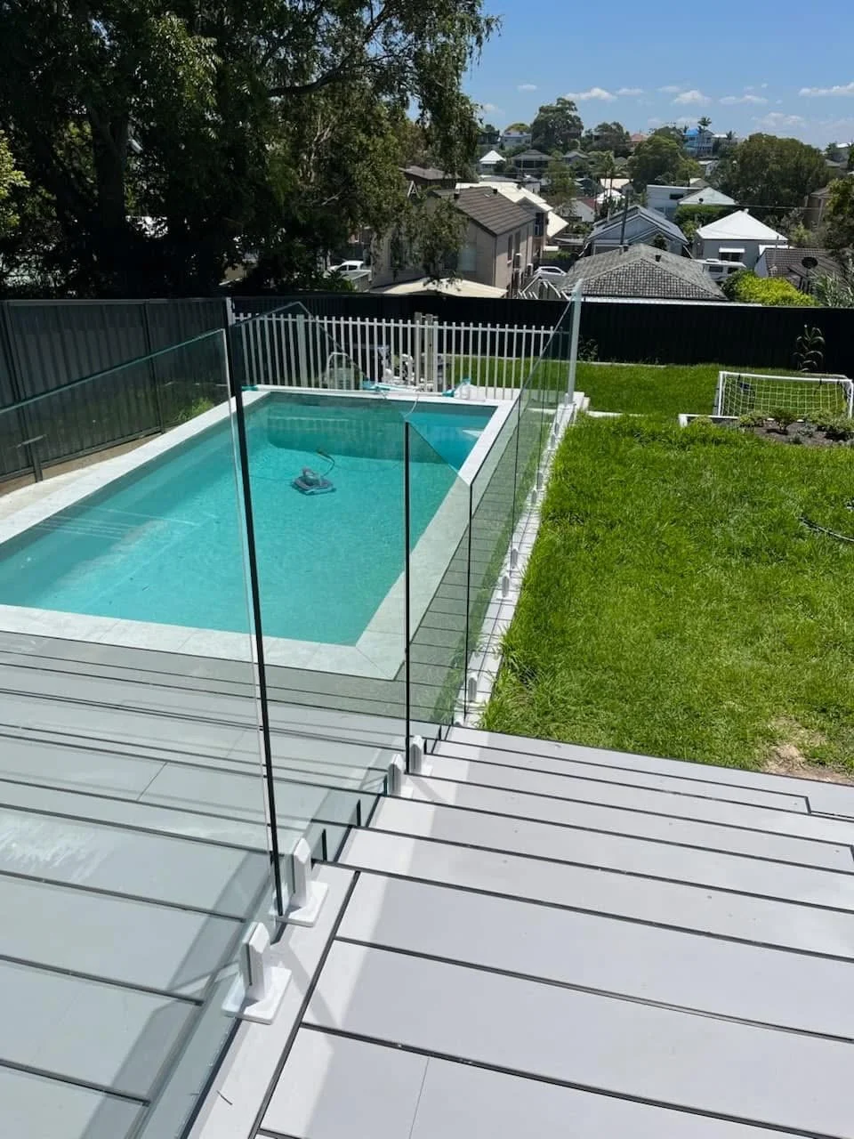 A blue swimming pool enclosed by a glass safety fence on a concrete patio, with a wooden deck area on one side and a gray metal fence surrounding the yard.