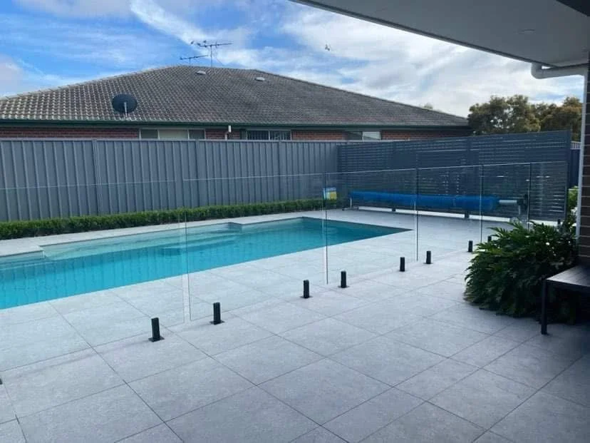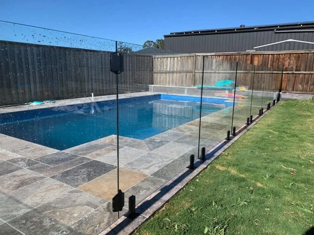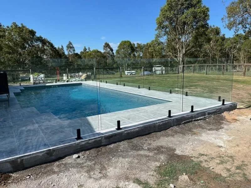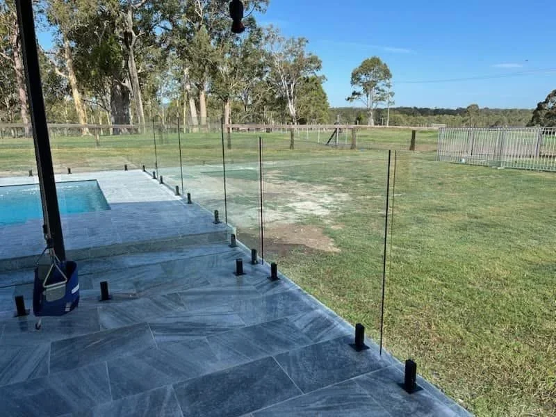 Glass pool fence installed on a patio overlooking a grassy backyard with trees and fence in the distance.