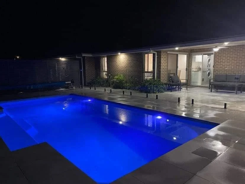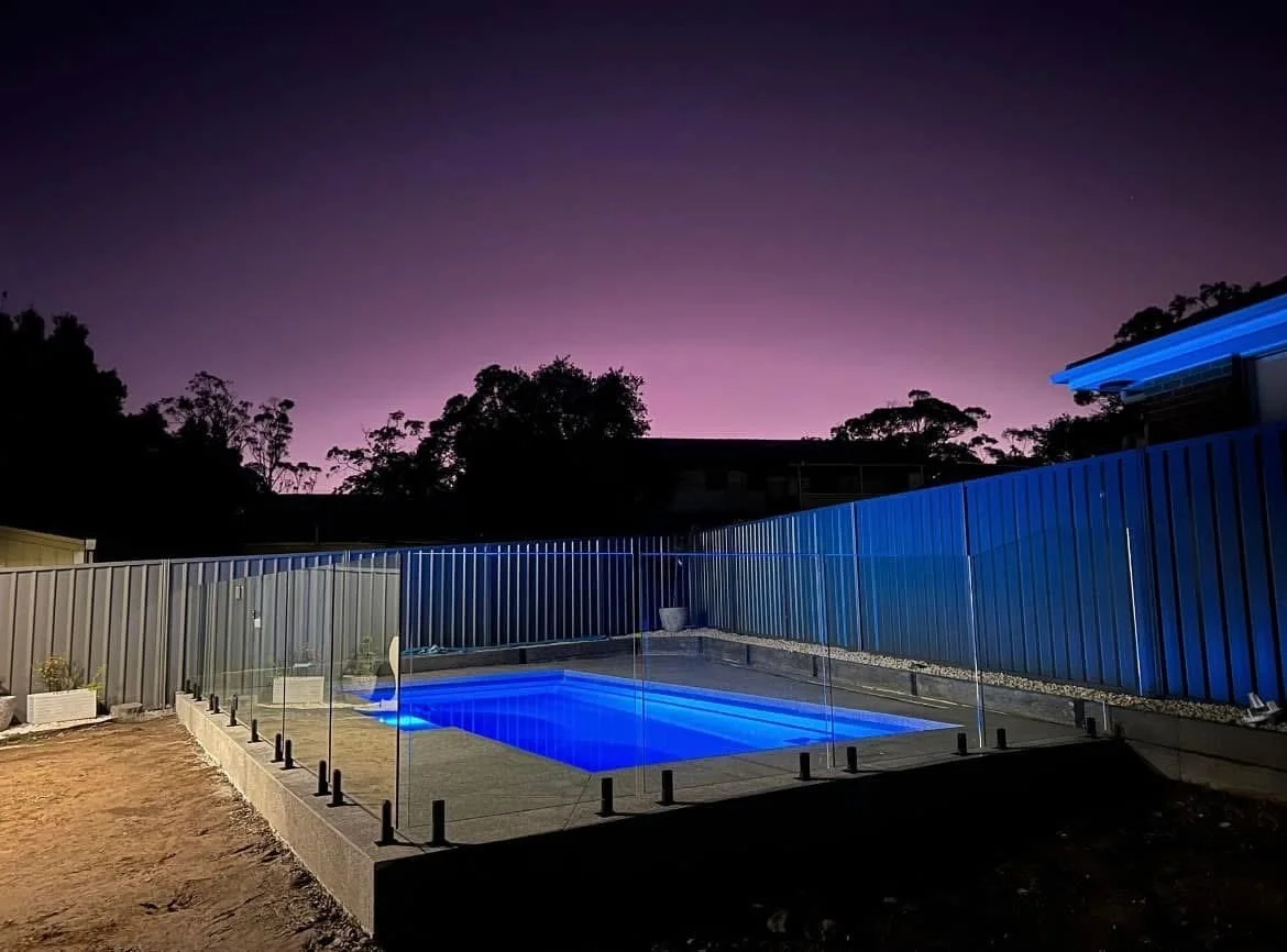 A fenced-in backyard swimming pool illuminated with blue lights at night, with a purple and dark blue sky and trees in the background.