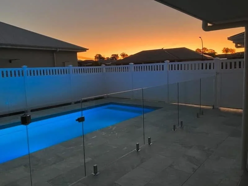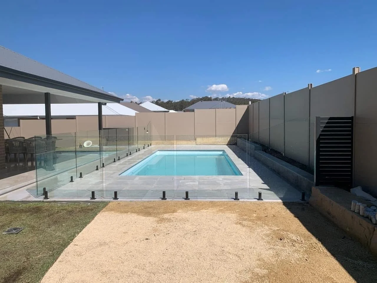 A swimming pool surrounded by a glass fence in an outdoor area, with trees and a clear blue sky in the background.