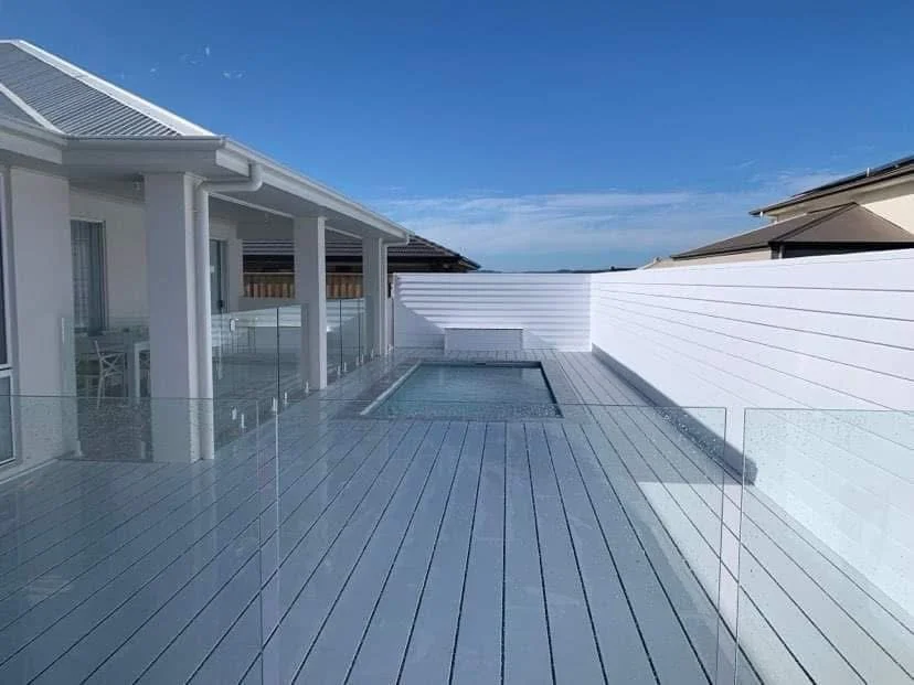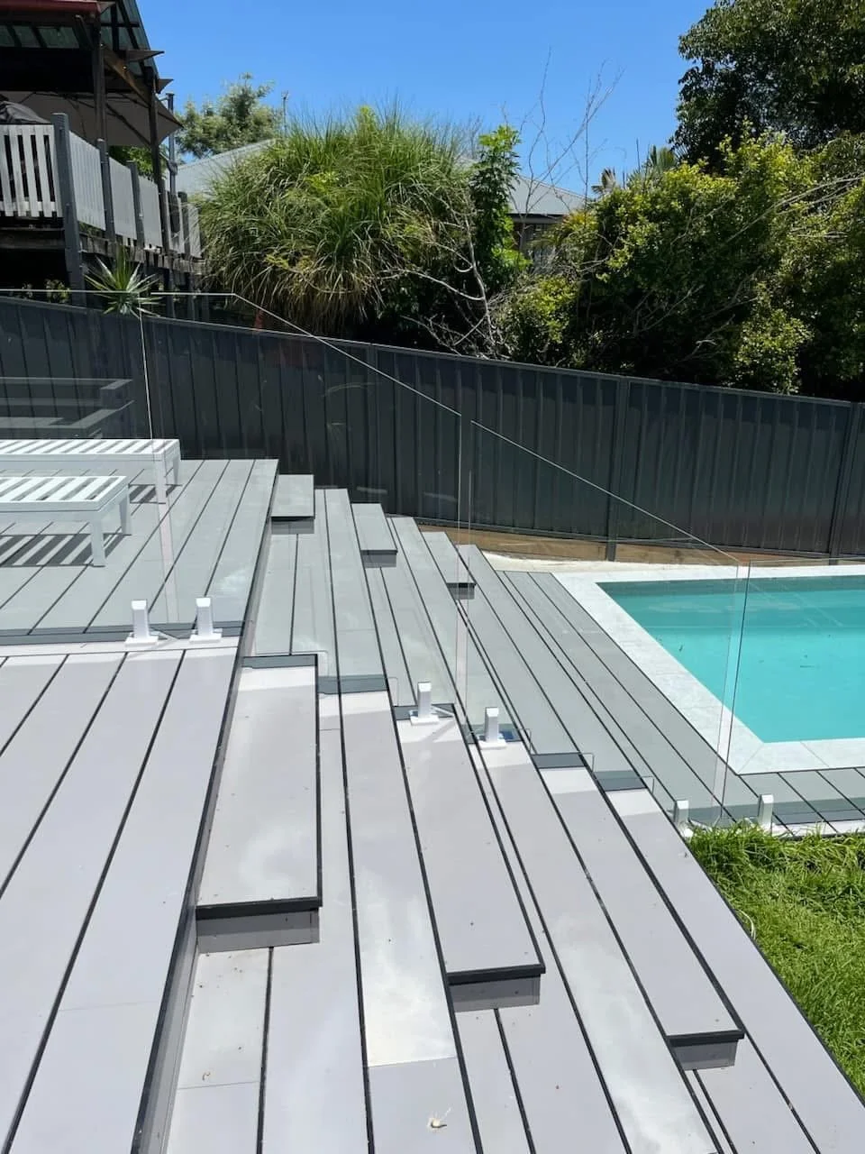 View of a modern outdoor deck with gray wooden planks, a glass railing, a pool, and trees in the background under a clear blue sky.