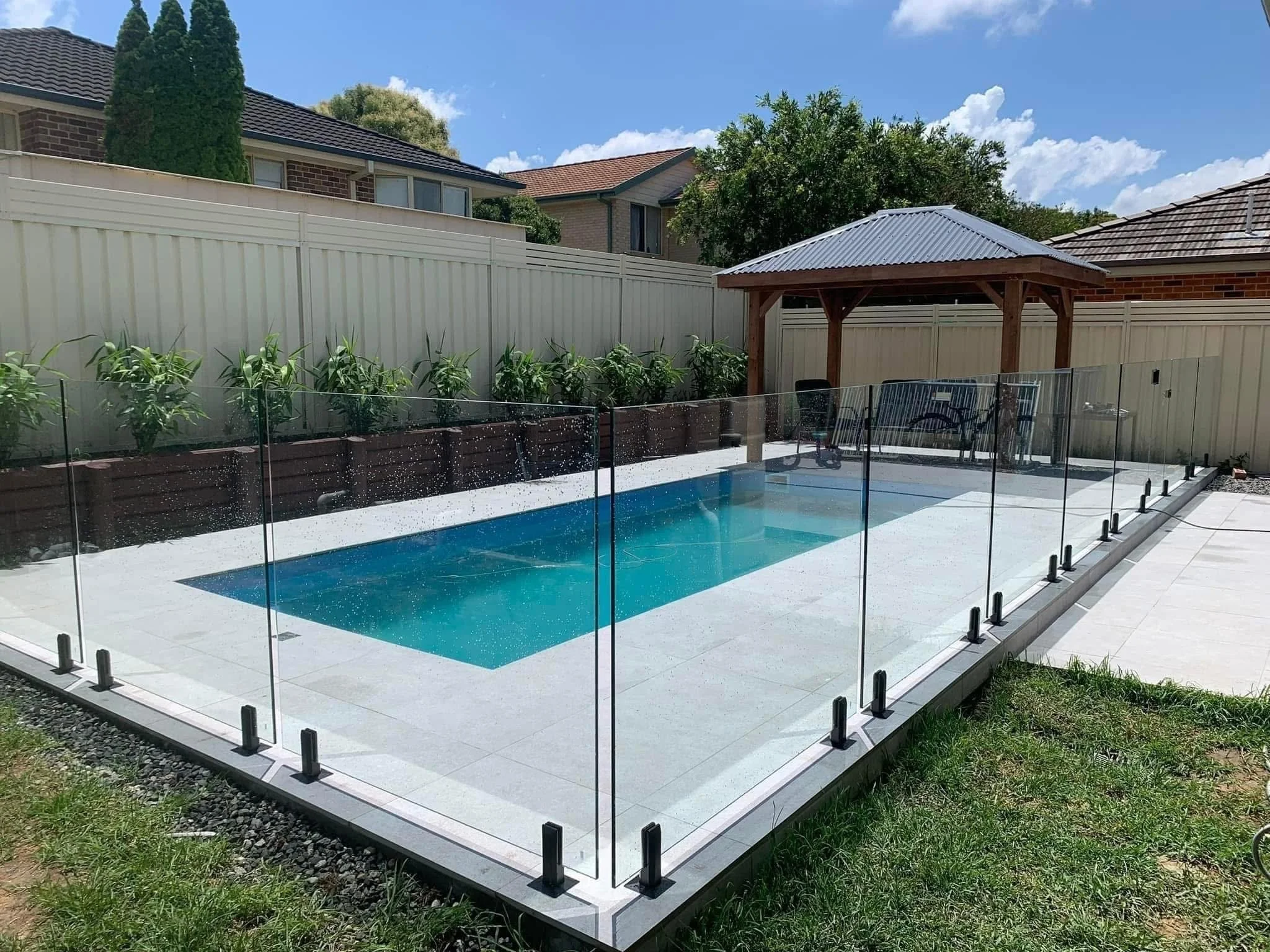 Backyard swimming pool with glass fencing and a wooden gazebo with outdoor furniture, surrounded by a beige fence and neighboring houses, under a partly cloudy sky.
