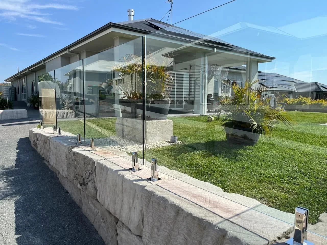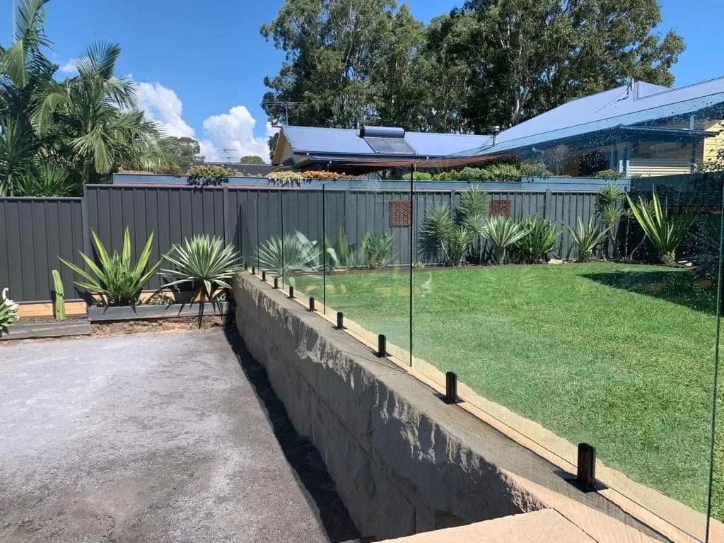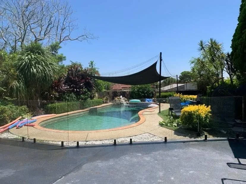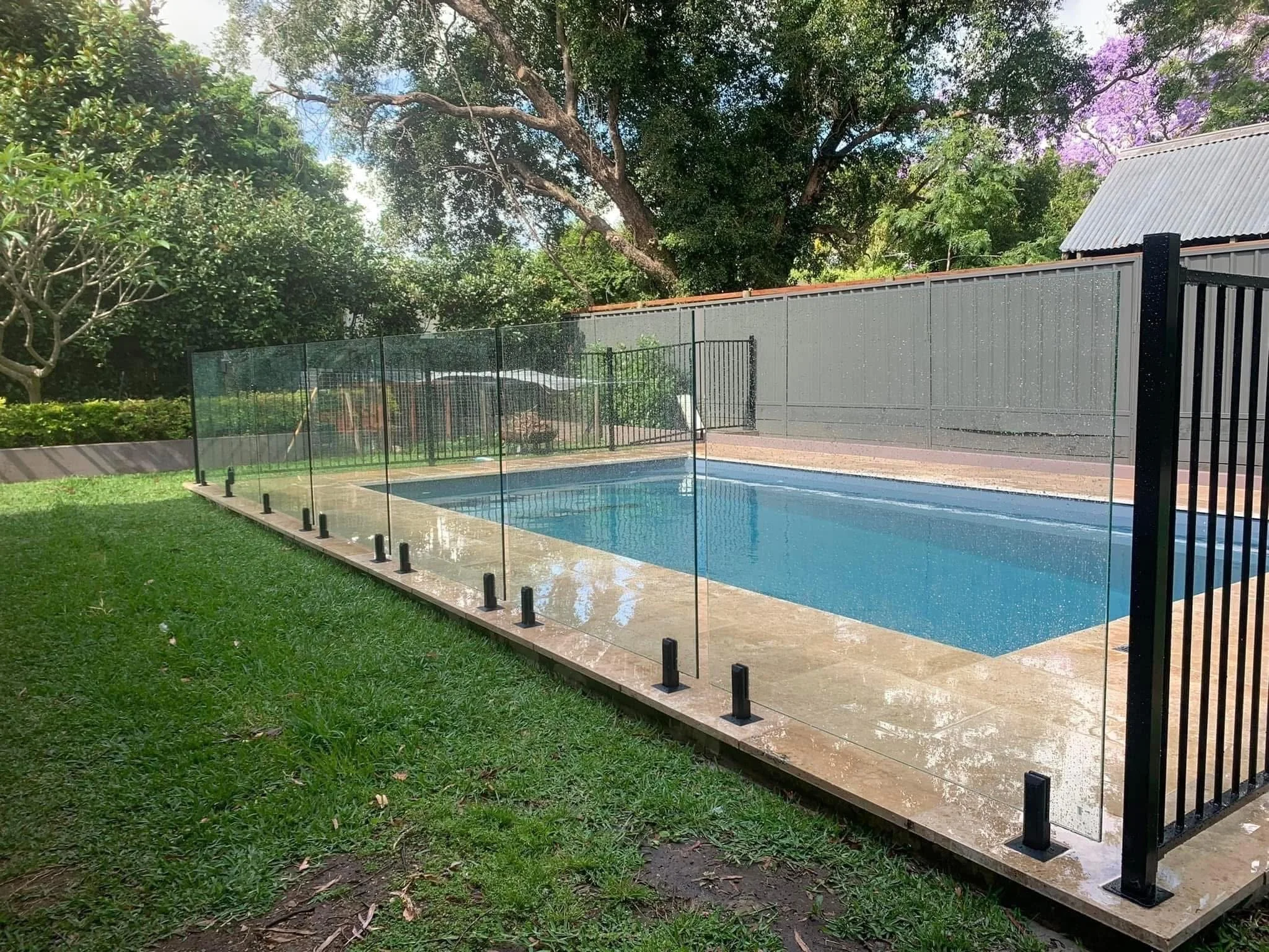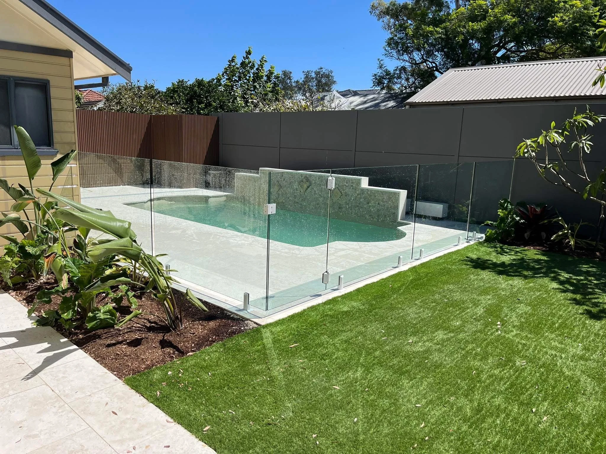 Private backyard swimming pool with safety glass fencing, surrounded by trees and a brick wall on a sunny day.