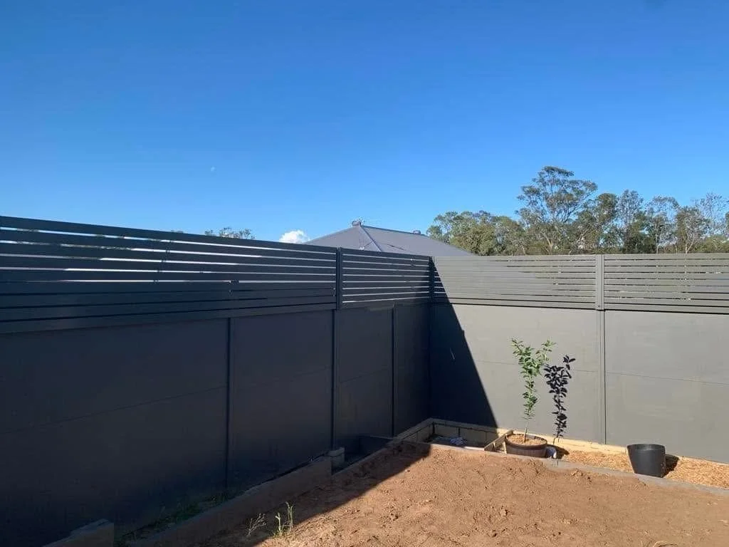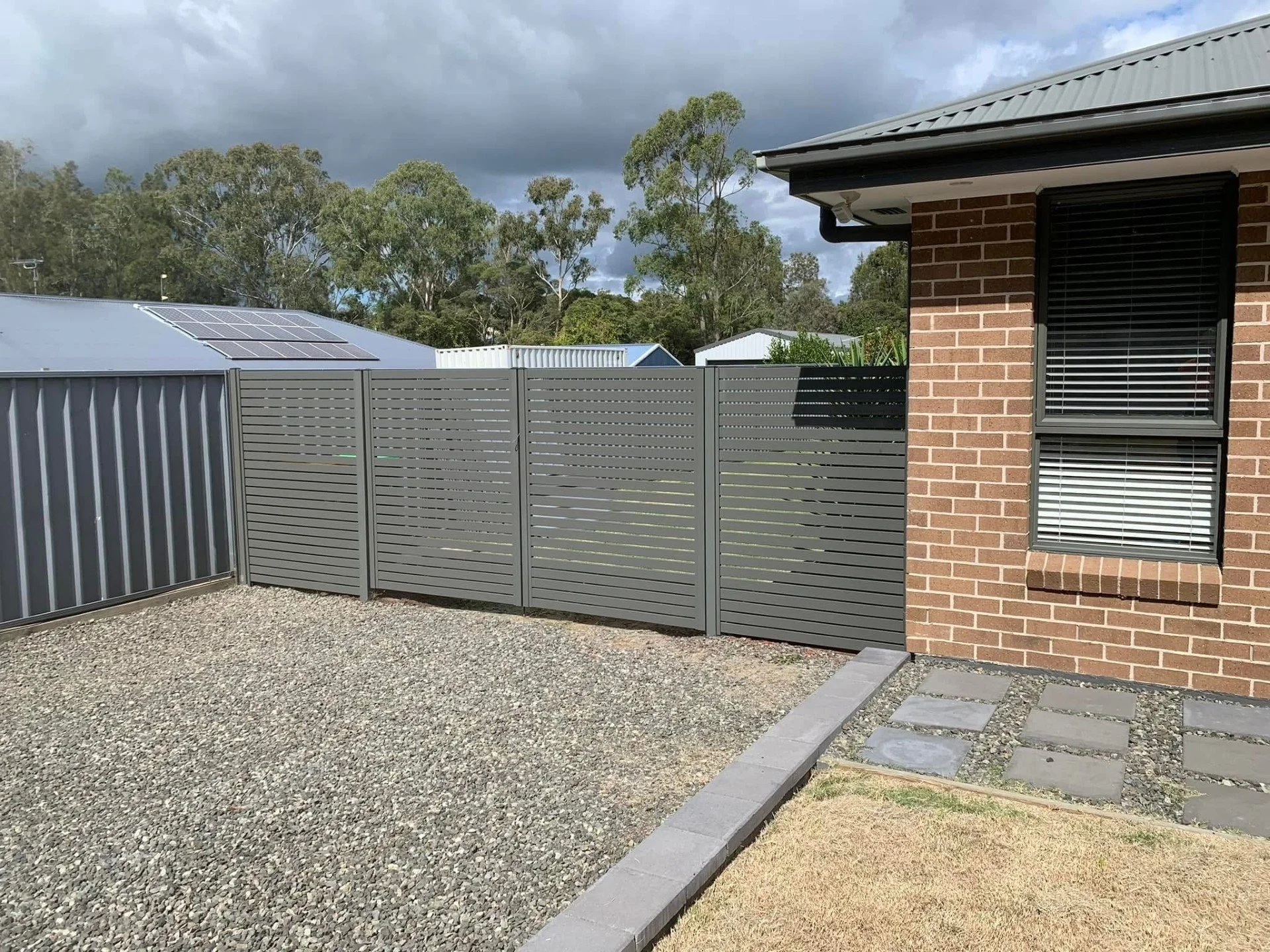Residential backyard with a grey metal fence, a brick house with black window blinds, a solar panel on the roof, and a cloudy sky in the background.