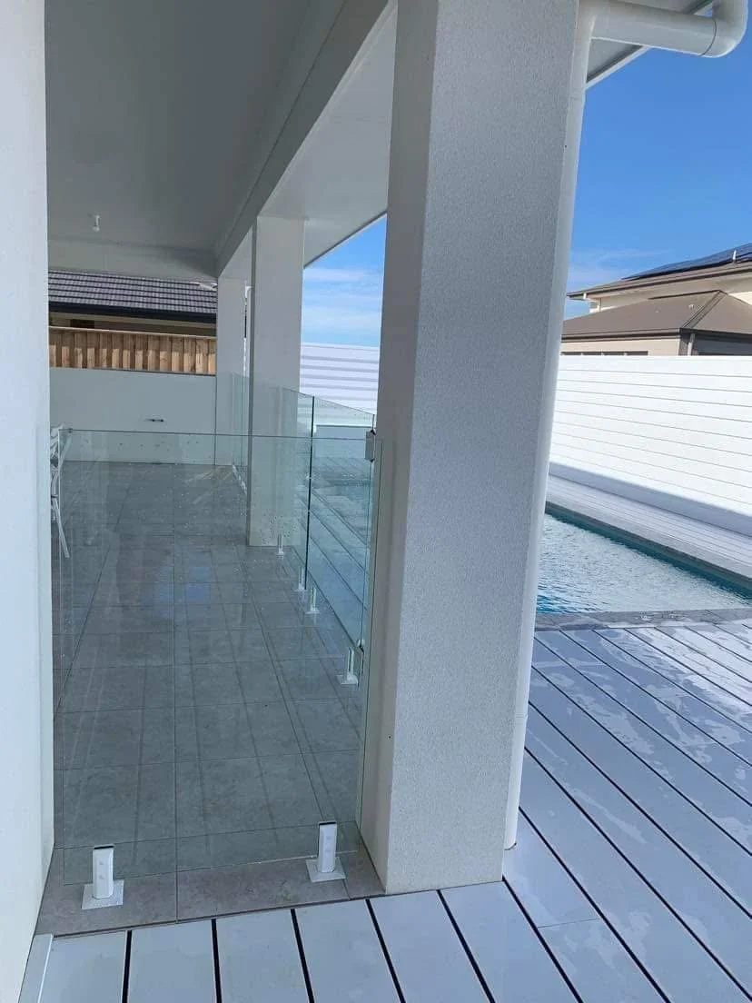Private backyard swimming pool enclosed by clear glass panels, with a wooden deck and a gray concrete surface, surrounded by metal fencing and some potted plants, under a partly cloudy sky.