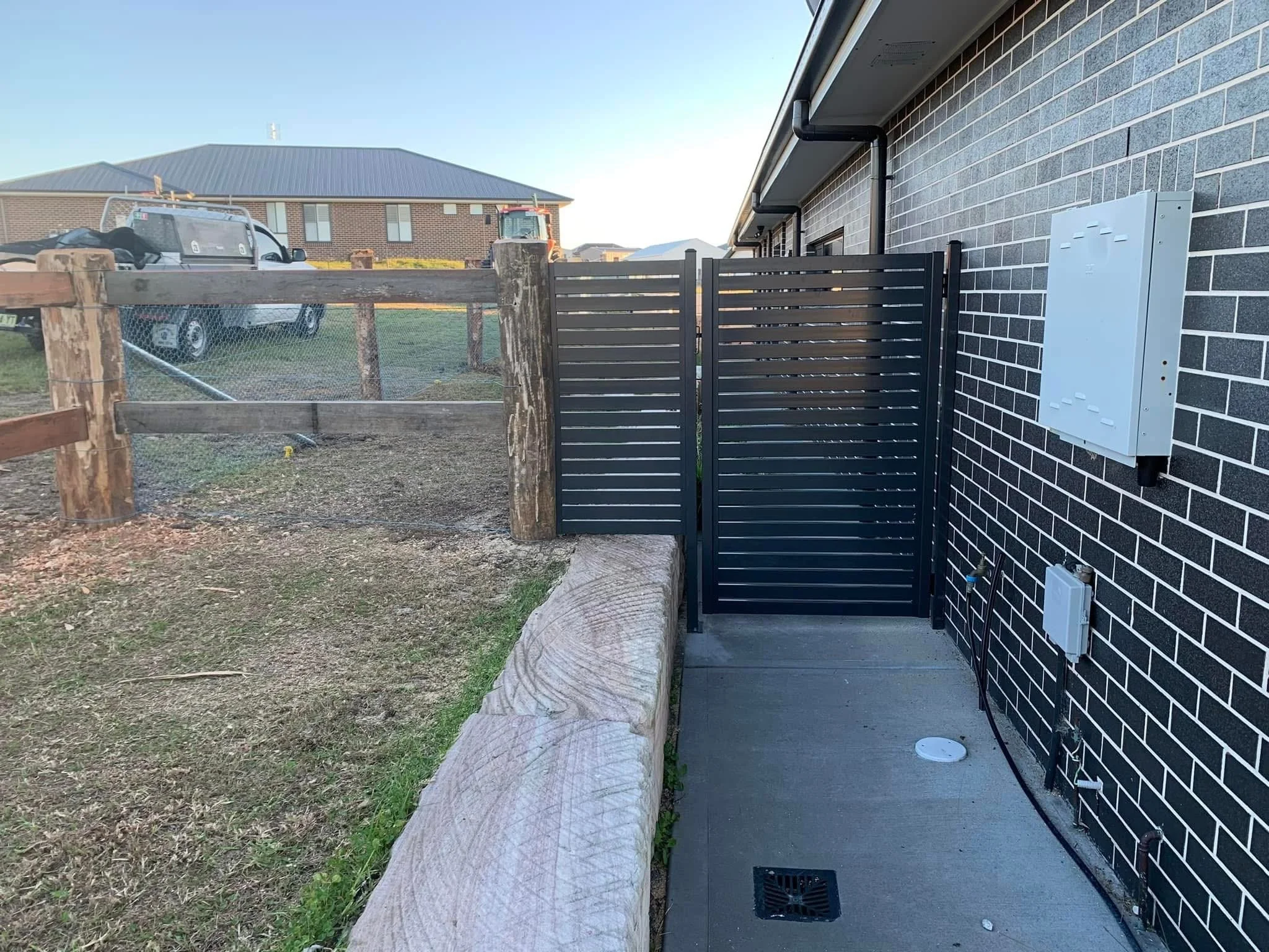 Side yard with a black gate, brick house wall, electrical boxes, and a concrete walkway.