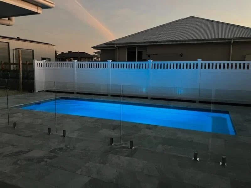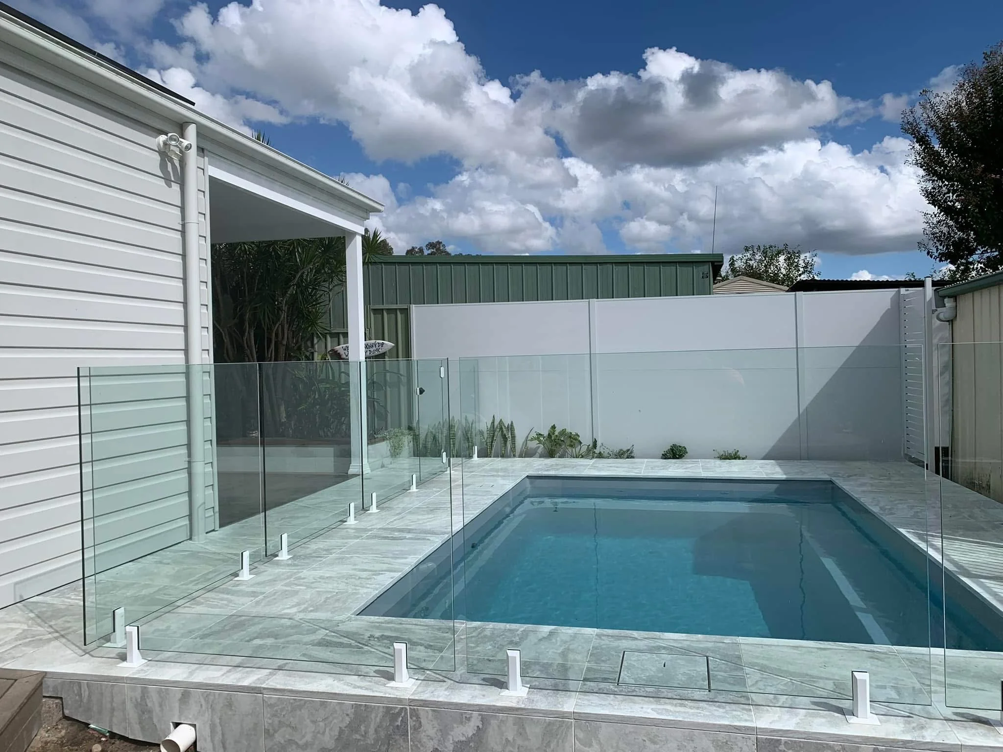 Private backyard with a small swimming pool enclosed by a clear glass fence, white house siding on the left, a white wall at the back, and a green storage shed in the background, under a partly cloudy sky.
