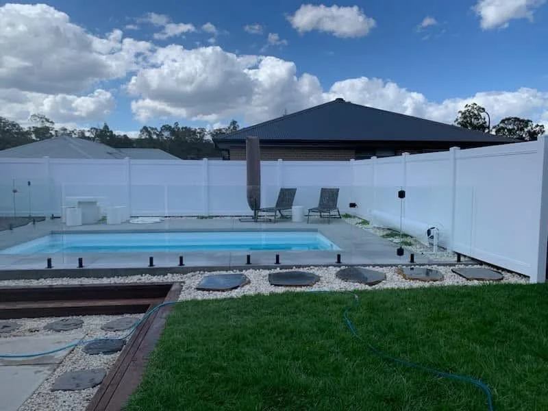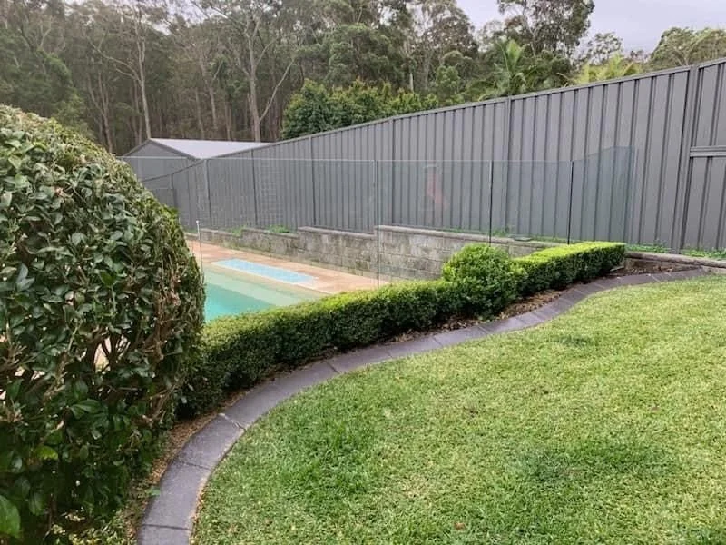 Backyard with a swimming pool, neatly trimmed hedges, a curved stone pathway, and a tall grey fence with a privacy screen, surrounded by trees.