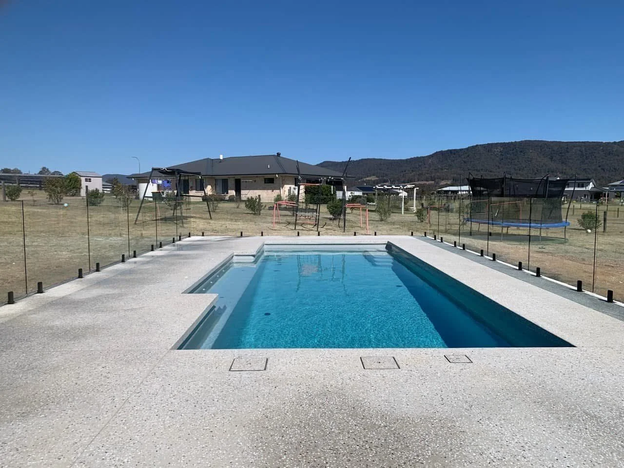 Backyard with a rectangular swimming pool enclosed by a glass fence, surrounded by a paved area with lounge chairs and potted plants.