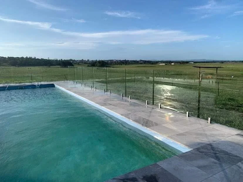 Glass fence beside a swimming pool overlooking a grassy landscape and blue sky with wispy clouds.